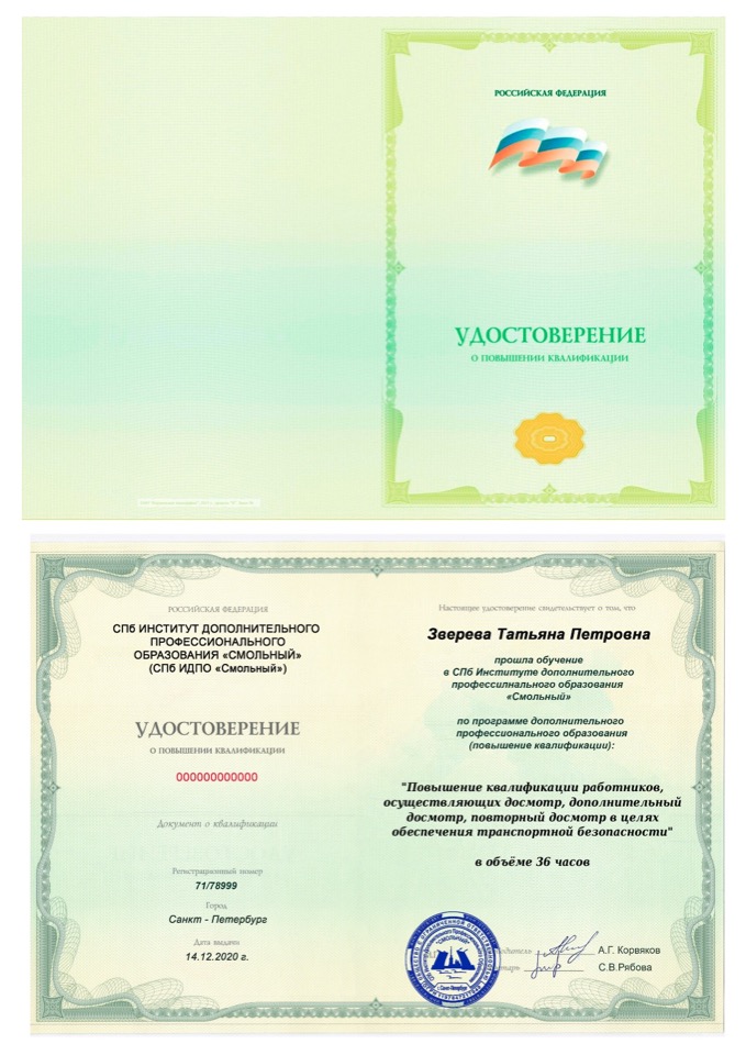 Санкт-Петербургский Институт дополнительного профессионального образования «Смольный» (СПб ИДПО «Смольный») осуществляет обучение специалистов по программе "Повышение квалификации работников, осуществляющих досмотр, дополнительный досмотр, повторный досмотр в целях обеспечения транспортной безопасности" в заочной форме (не указывается в документе) с применением дистанционных технологий. Для обучения достаточно наличие компьютера с выходом в информационную сеть Интернет.